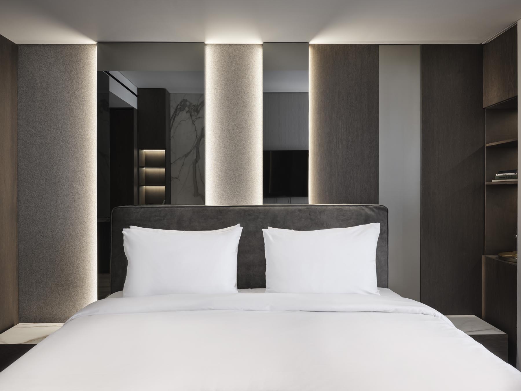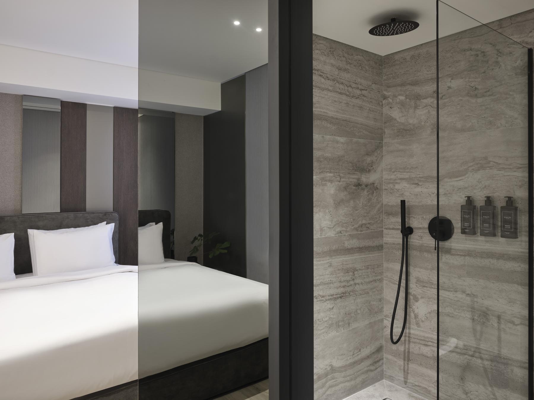 Featuring marble details and wood elements throughout, including the private bathroom with walk-in shower and complimentary slippers. Relax on a king-size bed for a restful night’s sleep while watching Netflix on a 55-inch QLED 4K Smart TV.